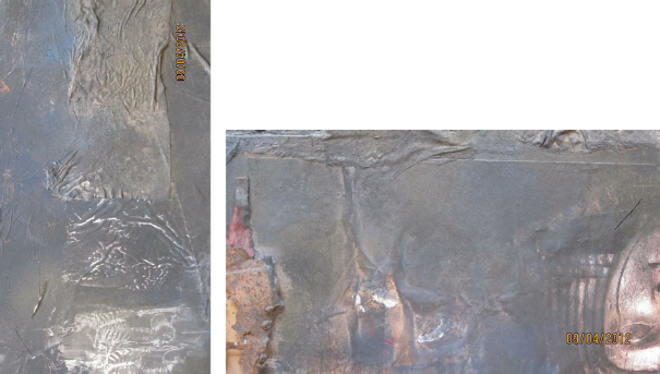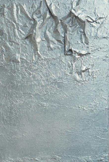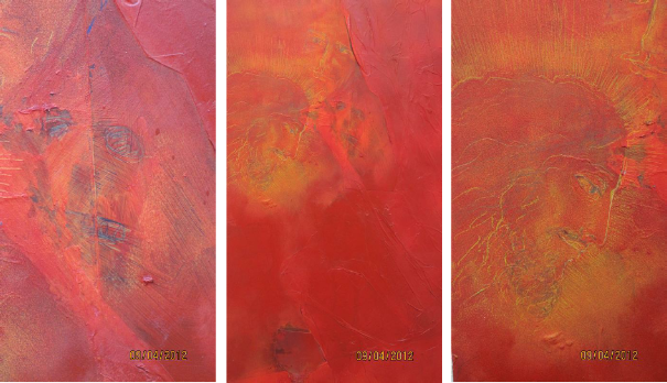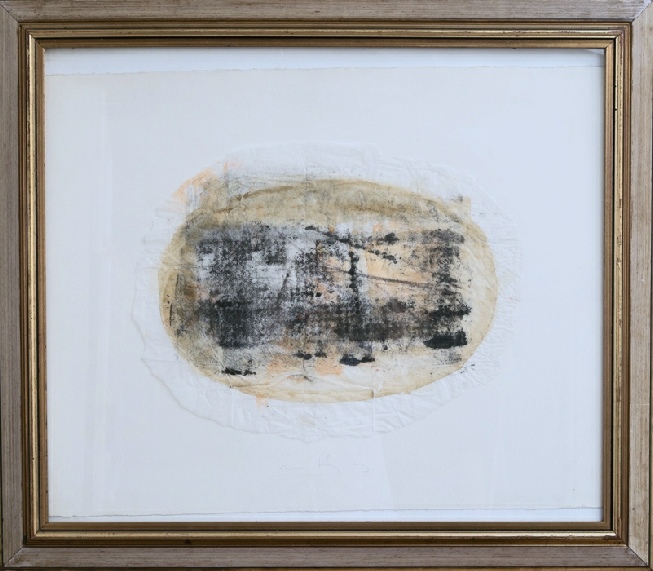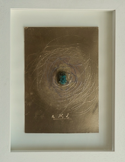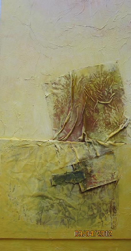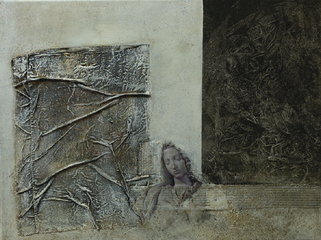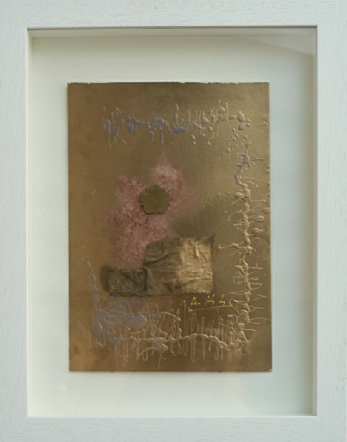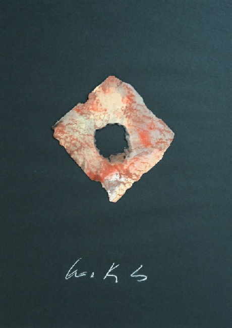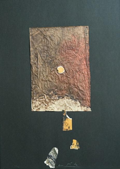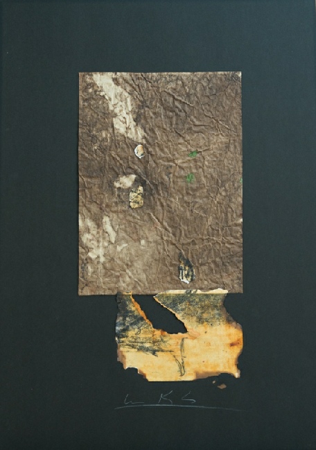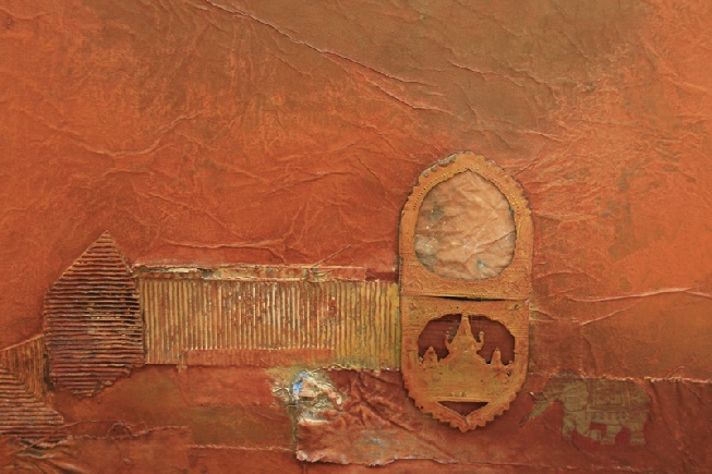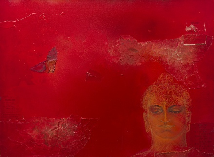 Die Vereinigung von Polaritäten vollzieht sich im Medium Collage und deren kontroverse Materialapplikationen. Aus Indien stammende Stofffetzen (ornamentierte Seide, Damast, Brokat), Maltücher, Seidenpapiere, Devotionalien und andere, oft antike Sammlertrophäen zählen zum Inventar der Materialcollagen. Eine aktuelle, kompositorisch ästhetisierte Inspirationsquelle ist die „Kesa“, eine buddhistische Ordenskutte, die traditionsgemäßvon angehenden Mönchen oder Nonnen in langwieriger Handarbeit aus Stoffresten (gebrauchte Textilien, Krankenhaus- und Leichentücher) angefertigt und Weiß (Reinheit, Entsagung) oder Gold (Erleuchtung) eingefärbt wird.