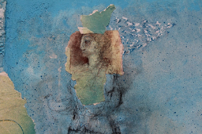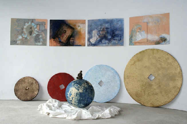 Der Mensch im Mittelpunkt auf einer Kugel, dem blauen Planeten. Der physische Körper ist Materie, zusammengesetzt aus den vierElementen, den Bestadteilen der Mutter Erde, dargestellt durch die vier farbigen Kreisscheiben. Der größere goldene Kreis symbolisiert die methaphysischen Ebene des Bewusstseins. Sophia, die Weisheit, ist das Bewusstsein, das sich im Laufe der Evolution vom Amnimalischen zum Göttlichen im Menschen entfaltet.